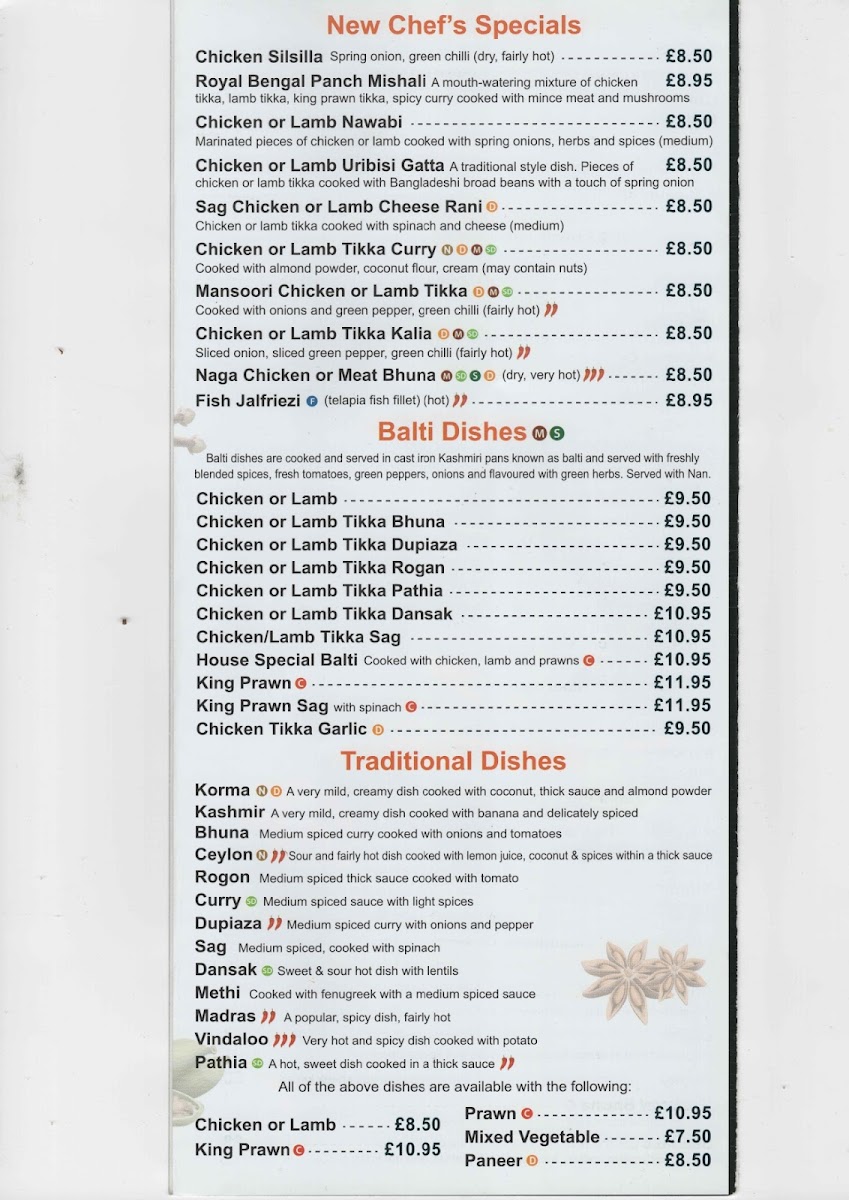 Cooked with fresh spices, mossalla sauce and green chilli (hot) highly spiced and cooked with green peppers and coriander.
