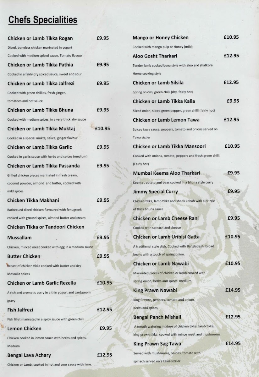 For those with a bigger appetite, the Authentic Dishes on the Bone, such as the 2 Whole Murghi Mossala (Meal for 2 people) or the Whole Kursi Lamb (for 2 people), offer a satisfying shared experience. The Chef’s Specialities, featuring dishes like Chicken or Lamb Tikka Rogan and Chicken or Lamb Tikka Jalfrezi, are great for those who want to try something beyond the usual.