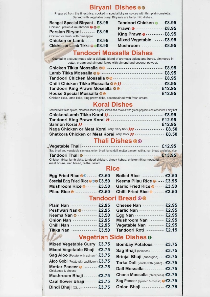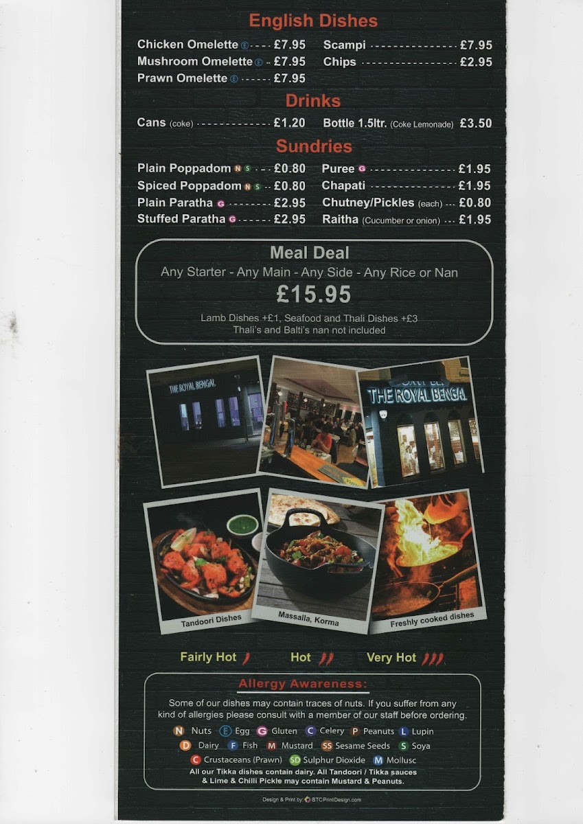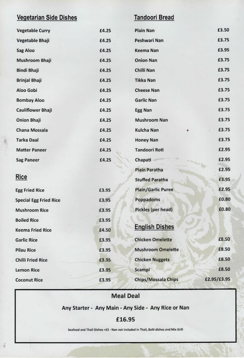 A diverse selection of Tandoori Bread, from Plain Nan to Chilli Nan, complements any dish, and the Rice choices, including Egg Fried Rice and Mushroom Rice, make perfect accompaniments. For those looking for something lighter, the Caesar Salads or English Dishes like Chicken Omelette and Scampi provide great alternatives.