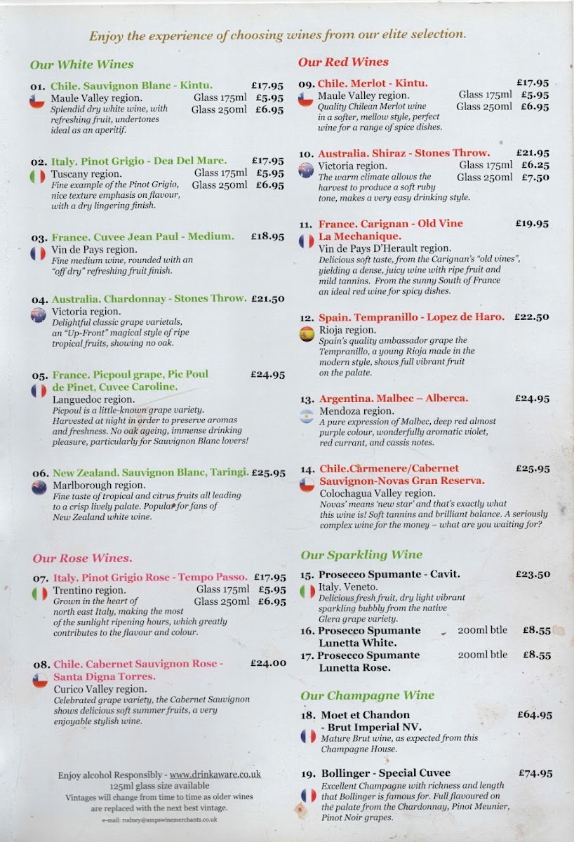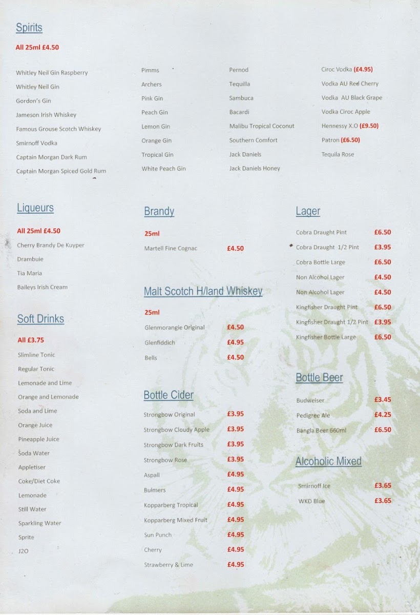 To wash down your meal, The Royal Bengal offers a fine collection of Wines, including Sauvignon Blanc from Chile and Merlot from Chile, along with an assortment of Spirits, including Jameson Irish Whiskey and Whitley Neil Gin. For beer lovers, options like Cobra Draught and Bangla Beer are available, along with refreshing Soft Drinks and Cider.