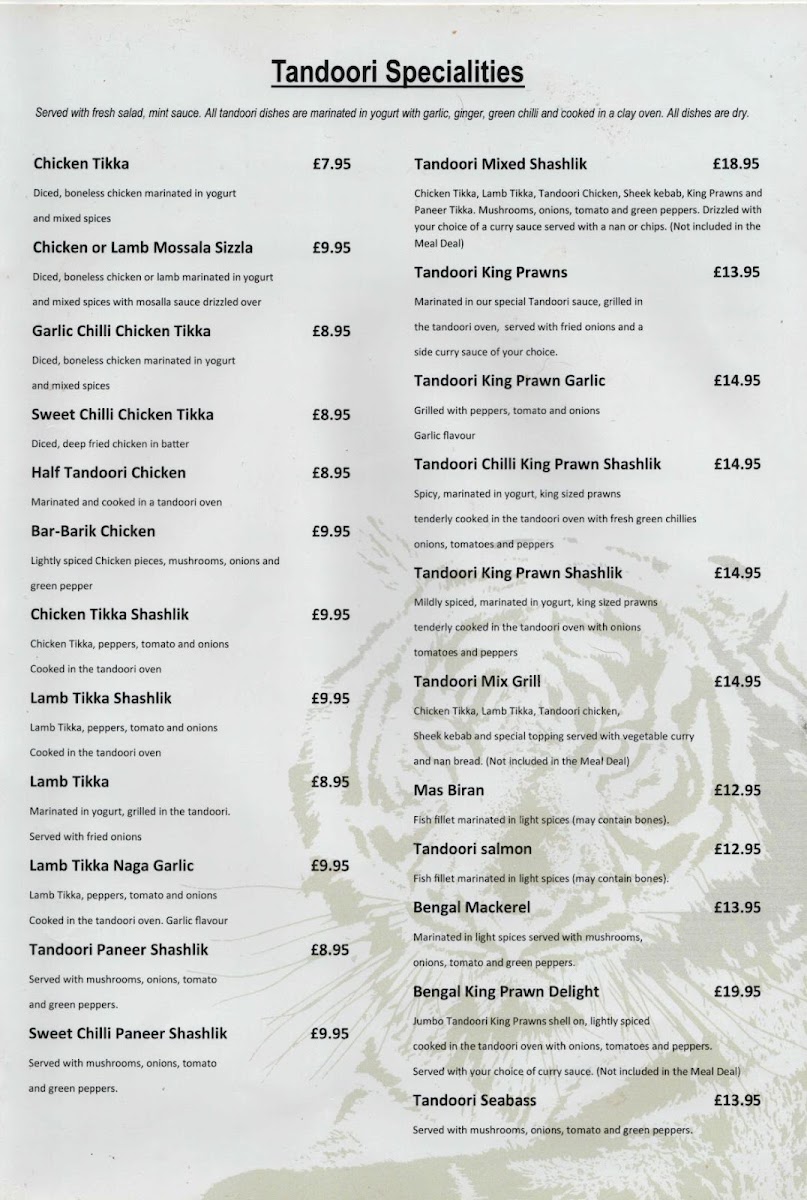 Chicken Tikka, Lamb Tikka, Tandoori chicken, Sheek kebab and special topping served with vegetable curry and nan bread. (Not included in the Meal Deal)